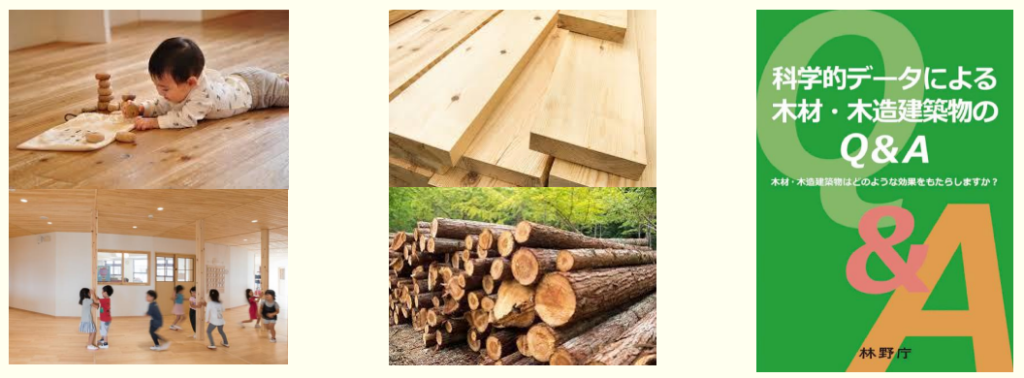 全国の木造園舎の事例も多数紹介され、木質空間が持つ柔らかい光・音・匂いが、子どもたちの安心感や集中力を引き出す様子が写真からも伝わります。